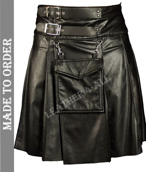 Men's Real Cow Leather Pleated Kilt Club Wear Kilt With Detachable Front Pocket