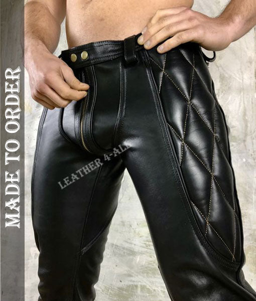 Men Real Leather Bikers Pants Diamond Quilted Panels MADE TO ORDER Leather Pants
