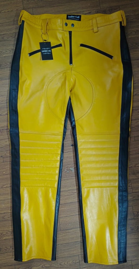 Men's Real Leather Bikers Pants Yellow Leather Quilted Panels Side Stripes Pants: