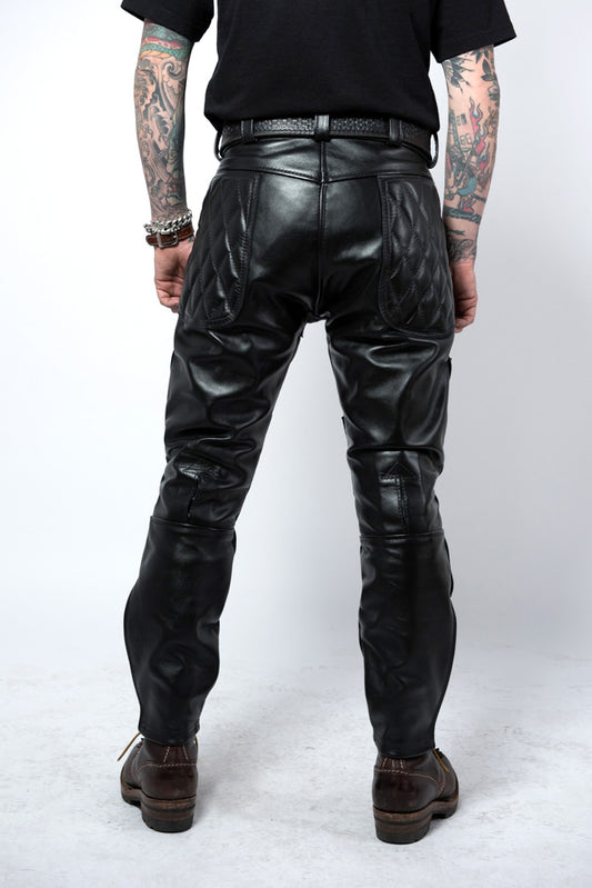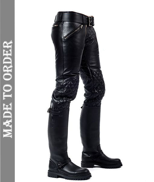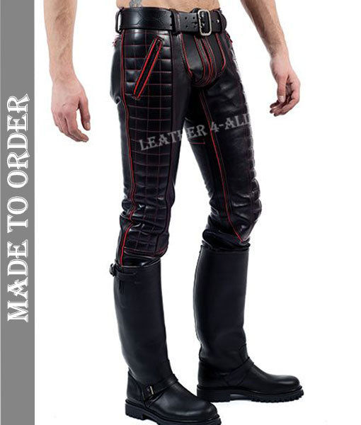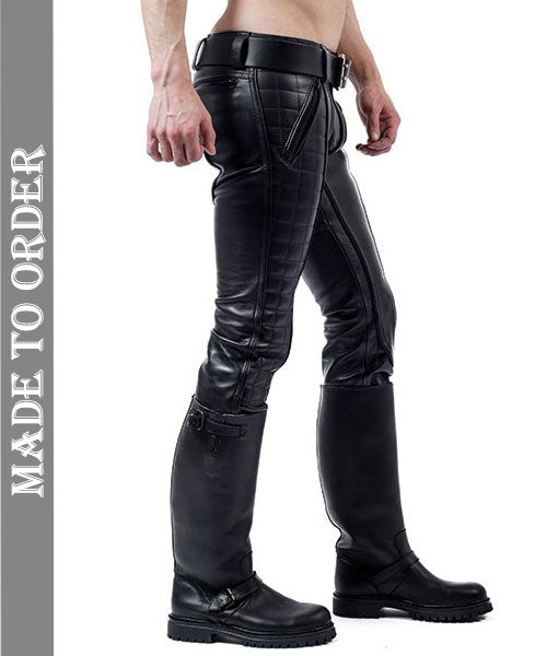 Men's Real Cowhide Natural Grain Leather Pants Quilted Panels Bikers / Gay Interest Pants