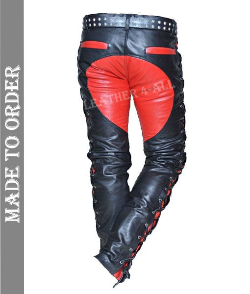 Men's Real Leather Bikers Pants Side And Front Laces Up Contrast Leather Panels Pants