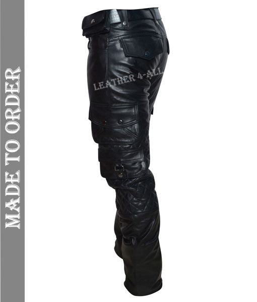 Men's Real Leather Bikers Cargo Pants With Quilted Panels And Multiple Pockets Trousers