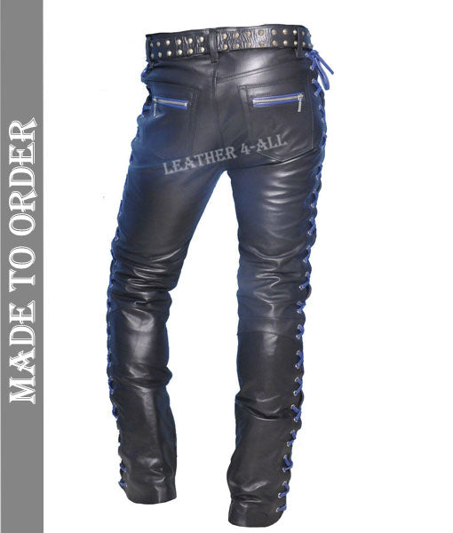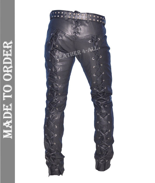 Men's Real Leather Bikers Pants Laces Up Front And Back Leather Pants