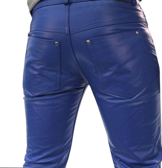 Men's Real Cowhide Leather 5 Pockets Bikers Pants In Blue Leather Bikers Pants