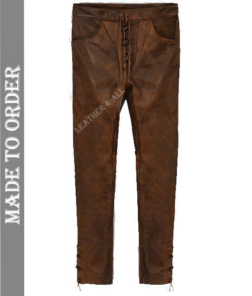 Men's Real Vintage Leather Pants Front Laces Up Closure 3 Pockets Vintage Bikers Leather Trousers
