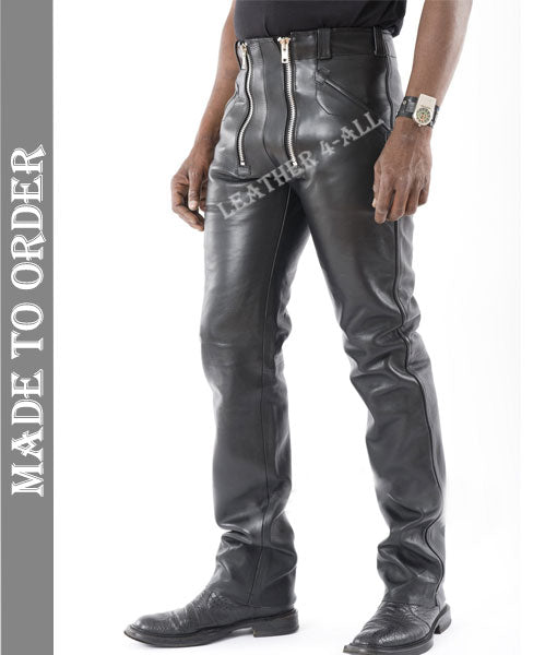 Men's Real Cowhide Leather Bikers Pants Exposed Fly BLUF Pants