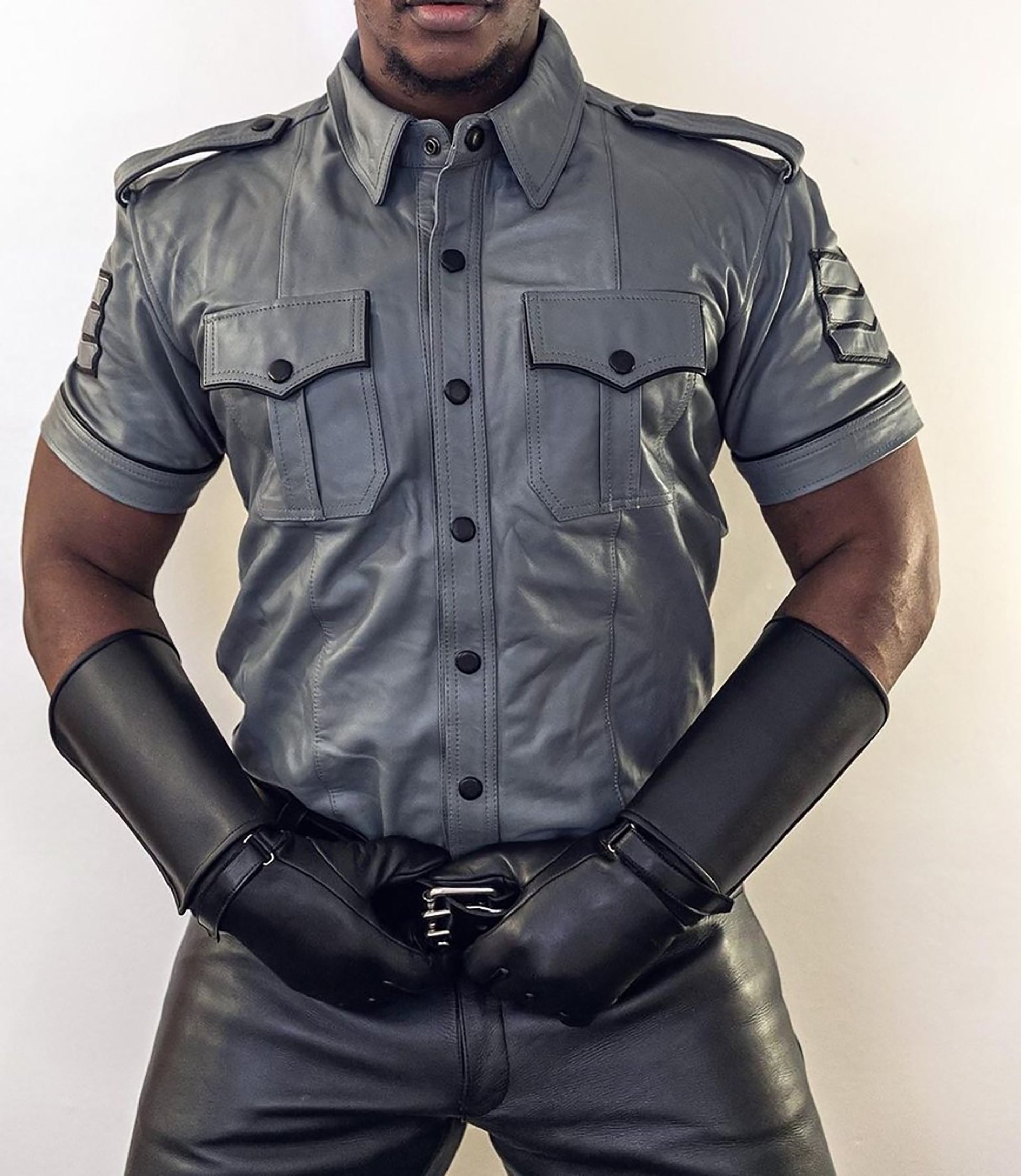 Men's Real Lamb Leather Police Uniform Shirt Sexy Short Sleeve Gray Leather Shirt